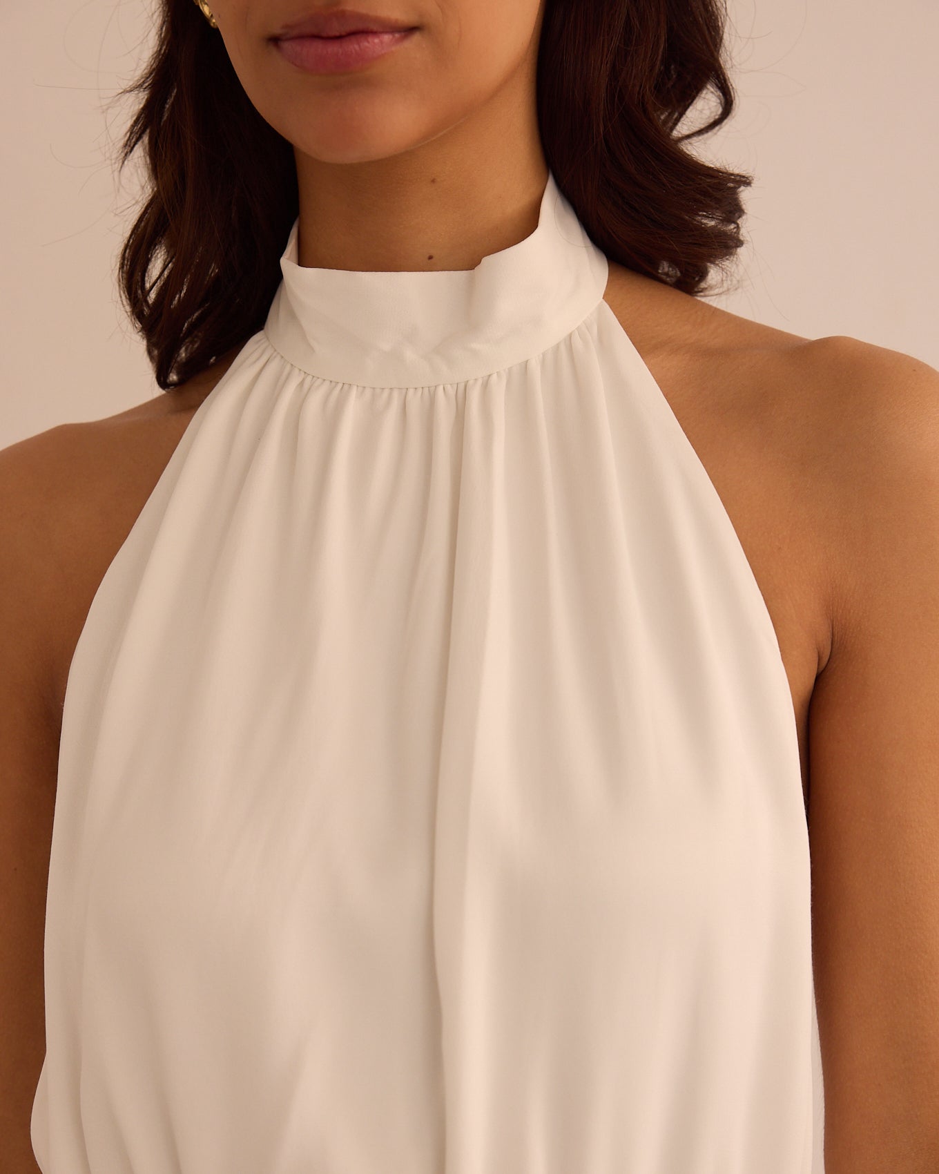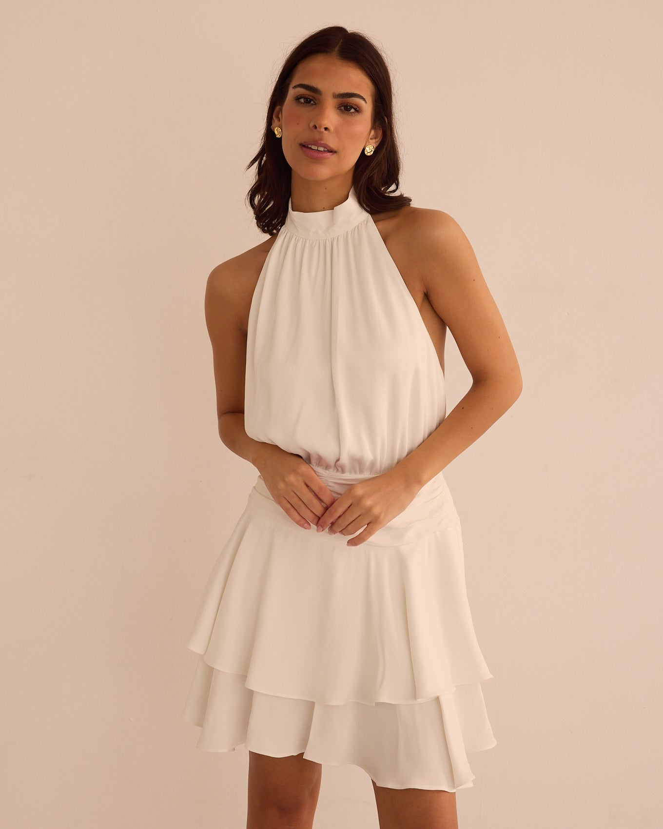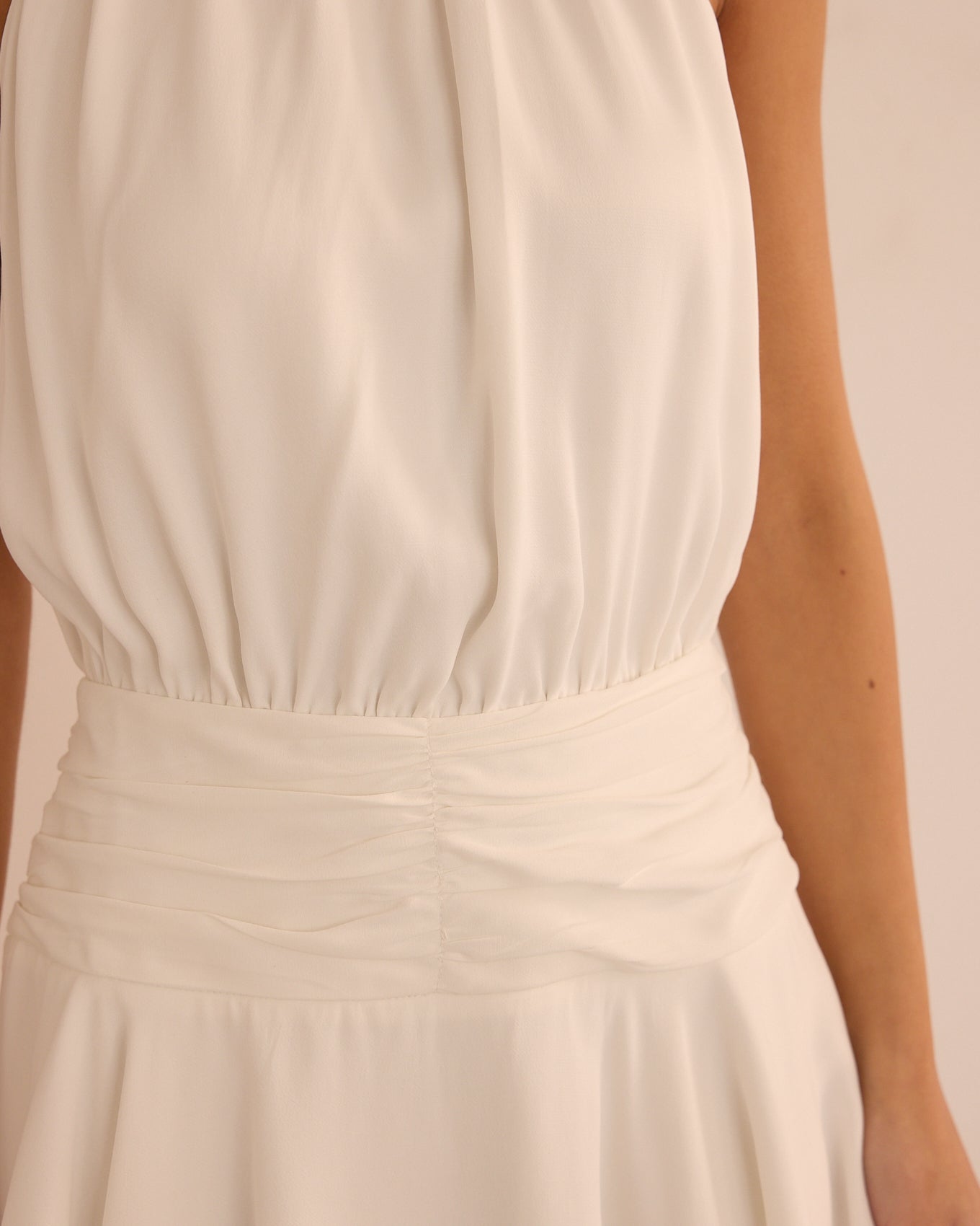 Short dress with a halter neckline and pleated detail at the bust. Defined waist with a ruched effect and a flowing skirt with movement. Back closure.